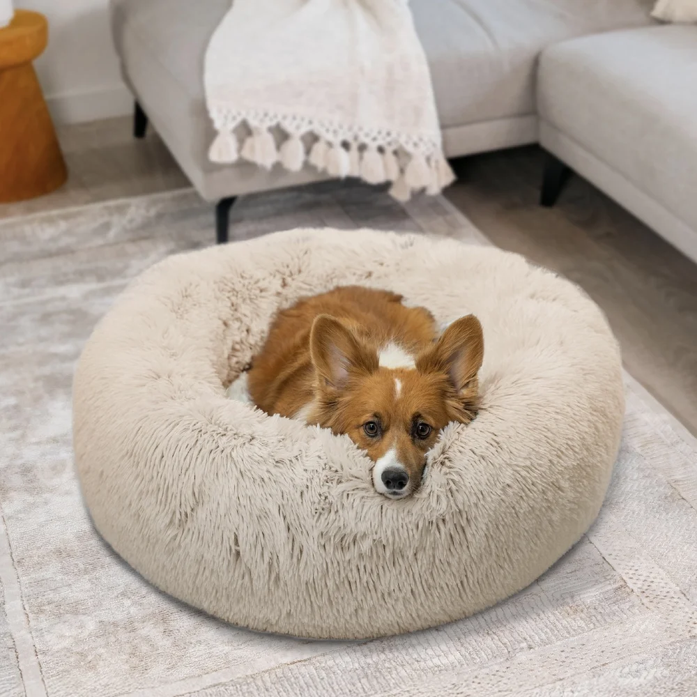Calming Shag Donut Cuddler Pet Bed with Throw Blanket Orthopedic Support Machine Washable Water Resistant Dogs Cats